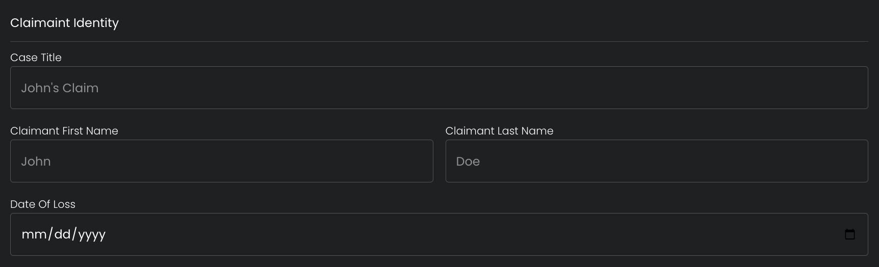 <figure><img src="https://450308035-files.gitbook.io/~/files/v0/b/gitbook-x-prod.appspot.com/o/spaces%2FXaZK6J3zMacJh3bKF3uy%2Fuploads%2FoWxvwvuL4SmAg5dGtNIc%2FScreenshot%202024-07-30%20at%202.40.55%E2%80%AFPM.png?alt=media&#x26;token=60cbec61-0485-4a55-af47-0856e1c9a0f3" alt=""><figcaption><p>Provide a Case Title, Claimant First Name, Claimant Last Name, Date Of Loss (mm/dd/yyyy)</p></figcaption></figure>